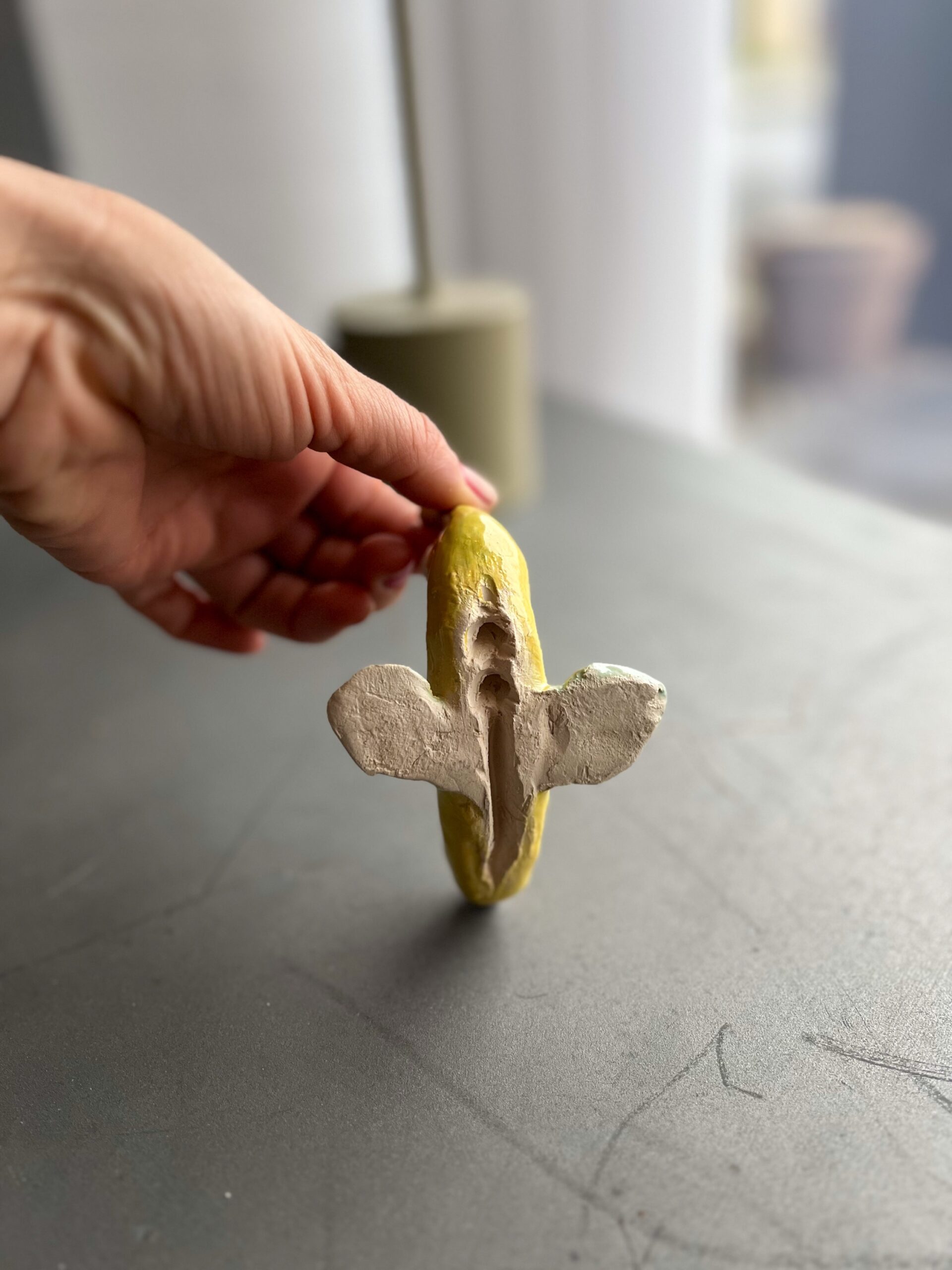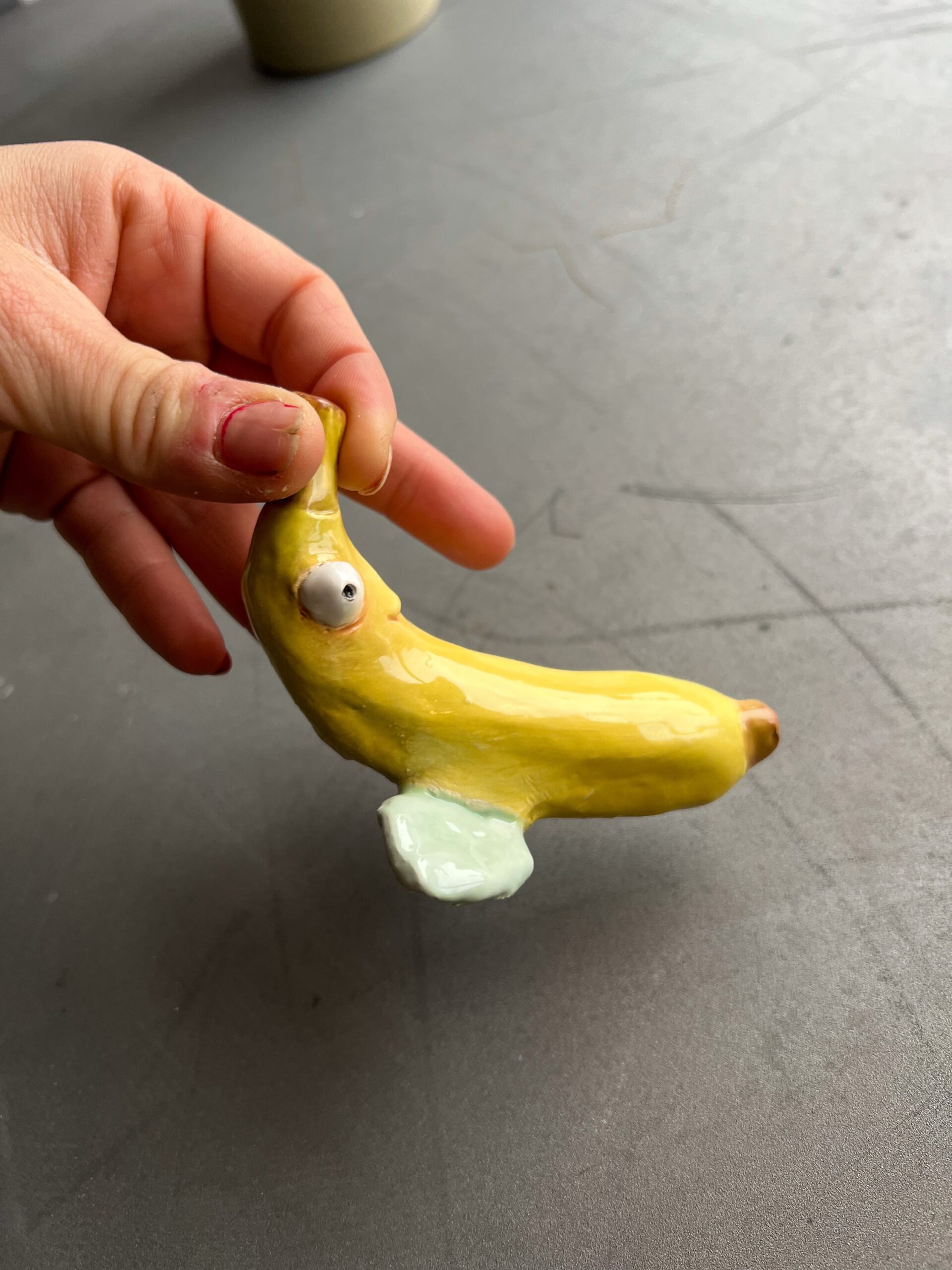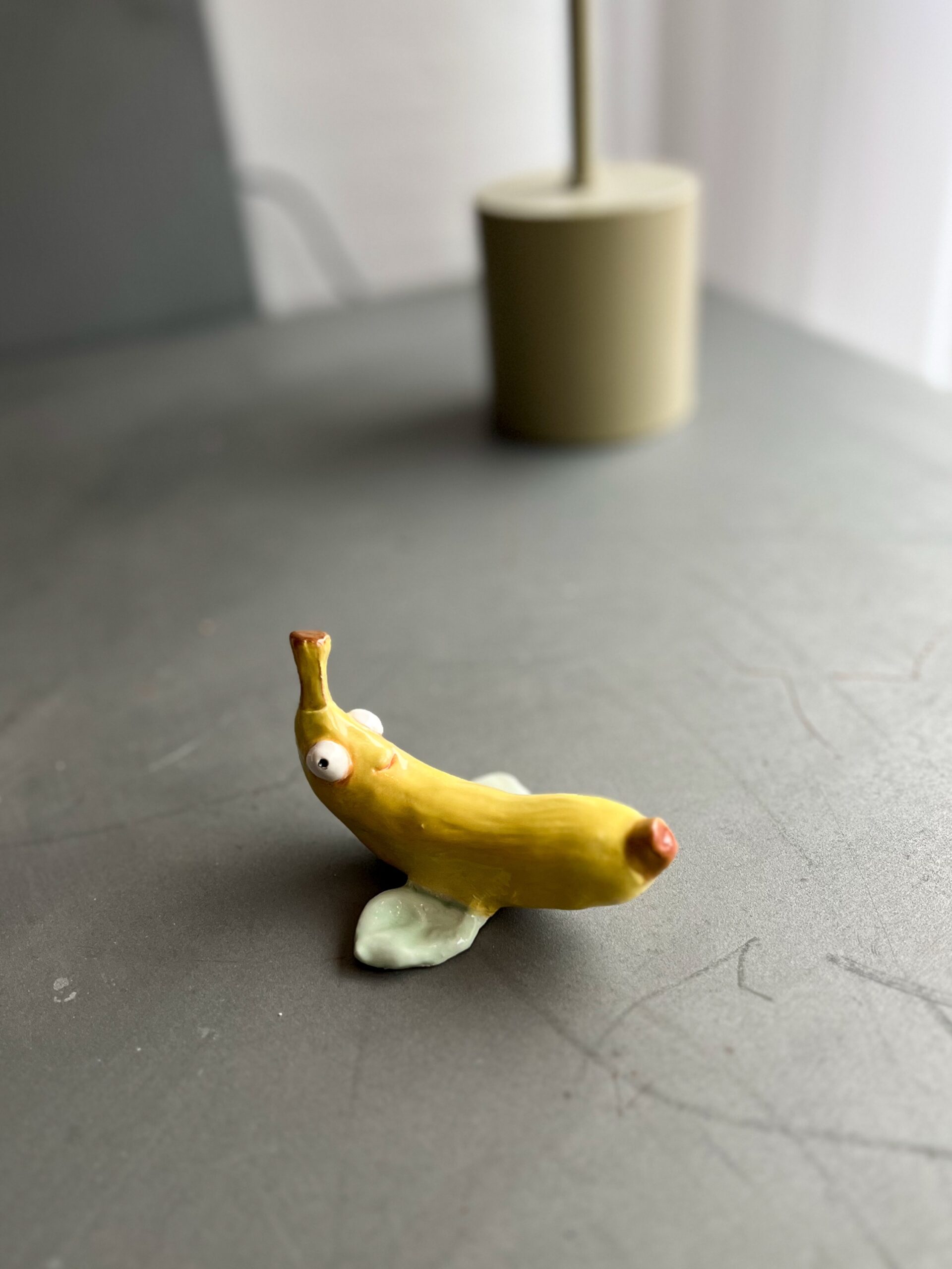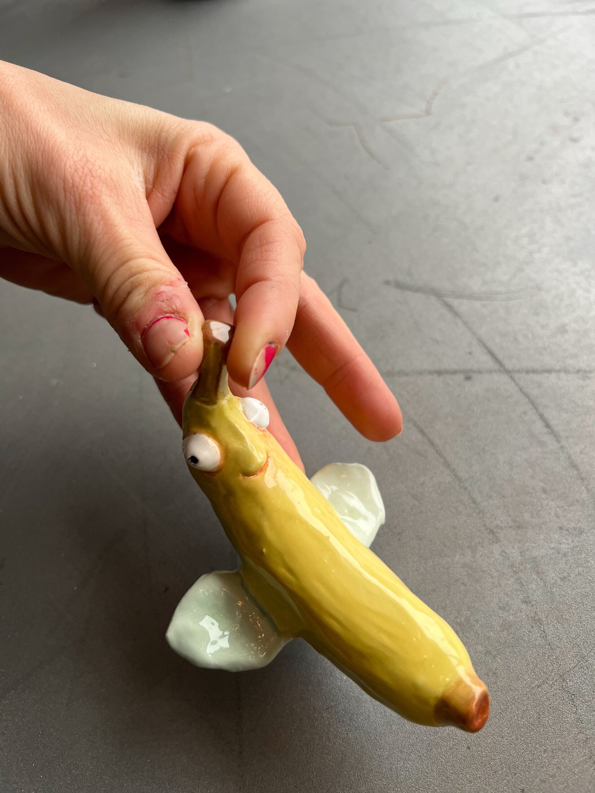 En banan med vinger? Ja! en bananflue sgu. Sådan helt bogstaveligt. Pisseirriterende element i hjemmet, når den summer rundt i mad, vin og næsebor.. Men med en keramik-bananflue på din væg kan du med ro tage verden en anelse mindre alvorligt – og bogstaveligt.