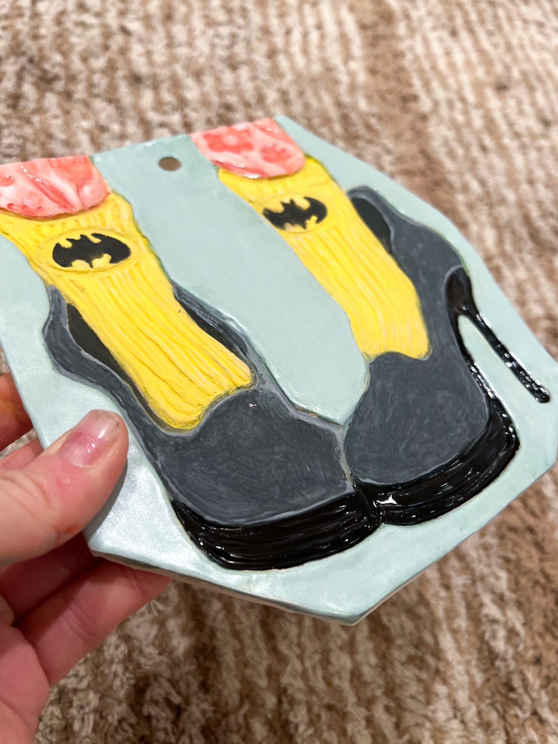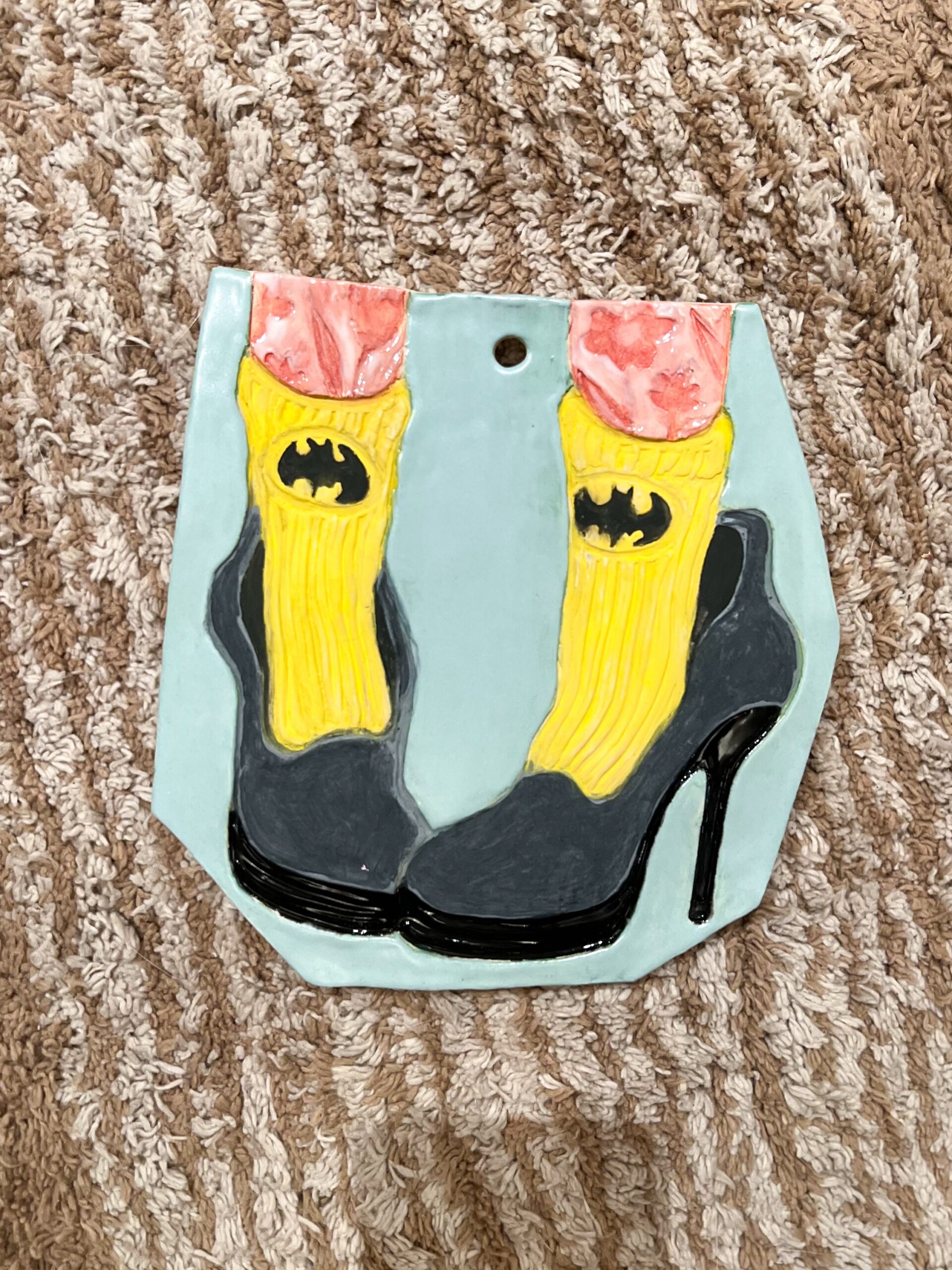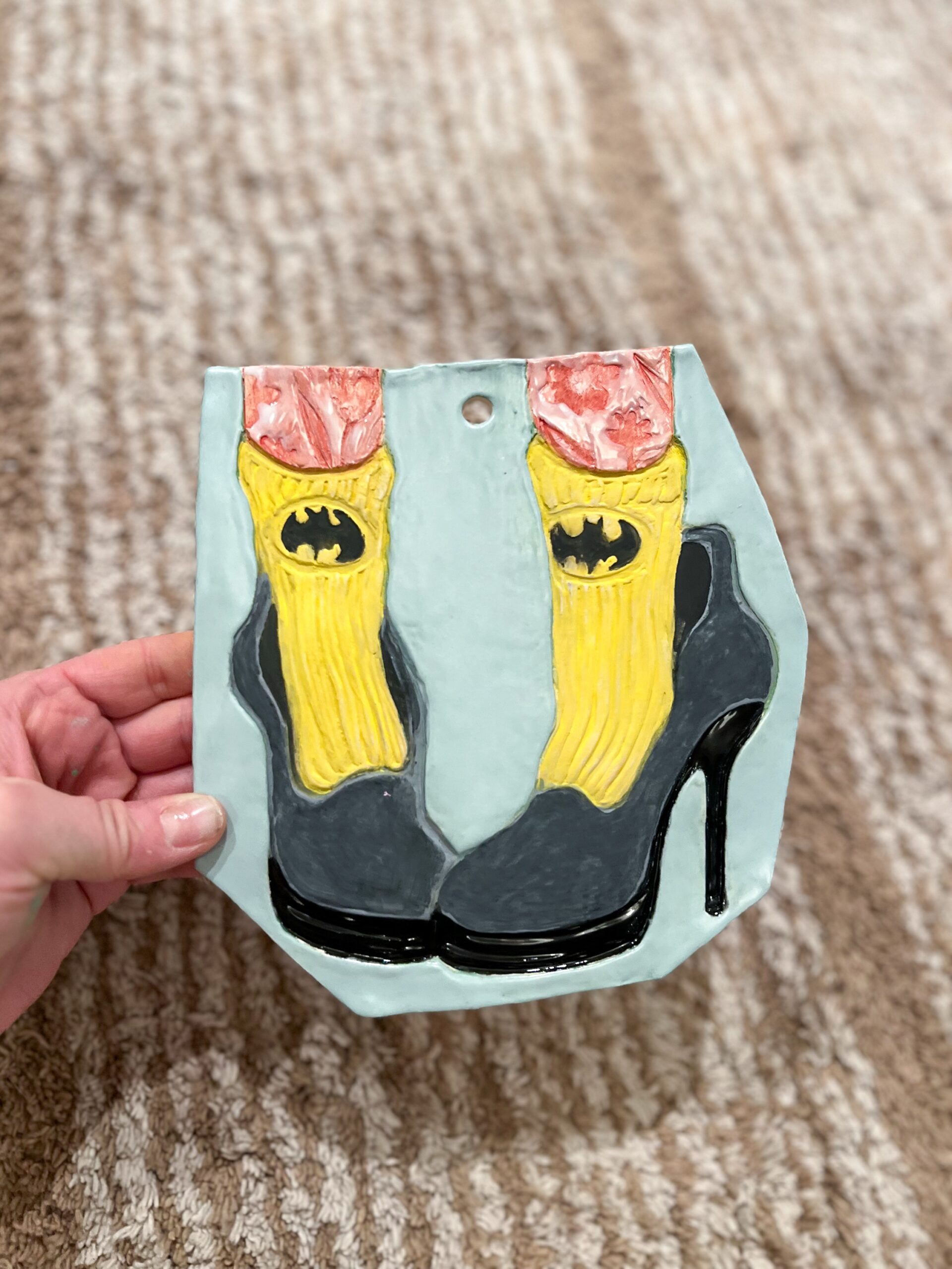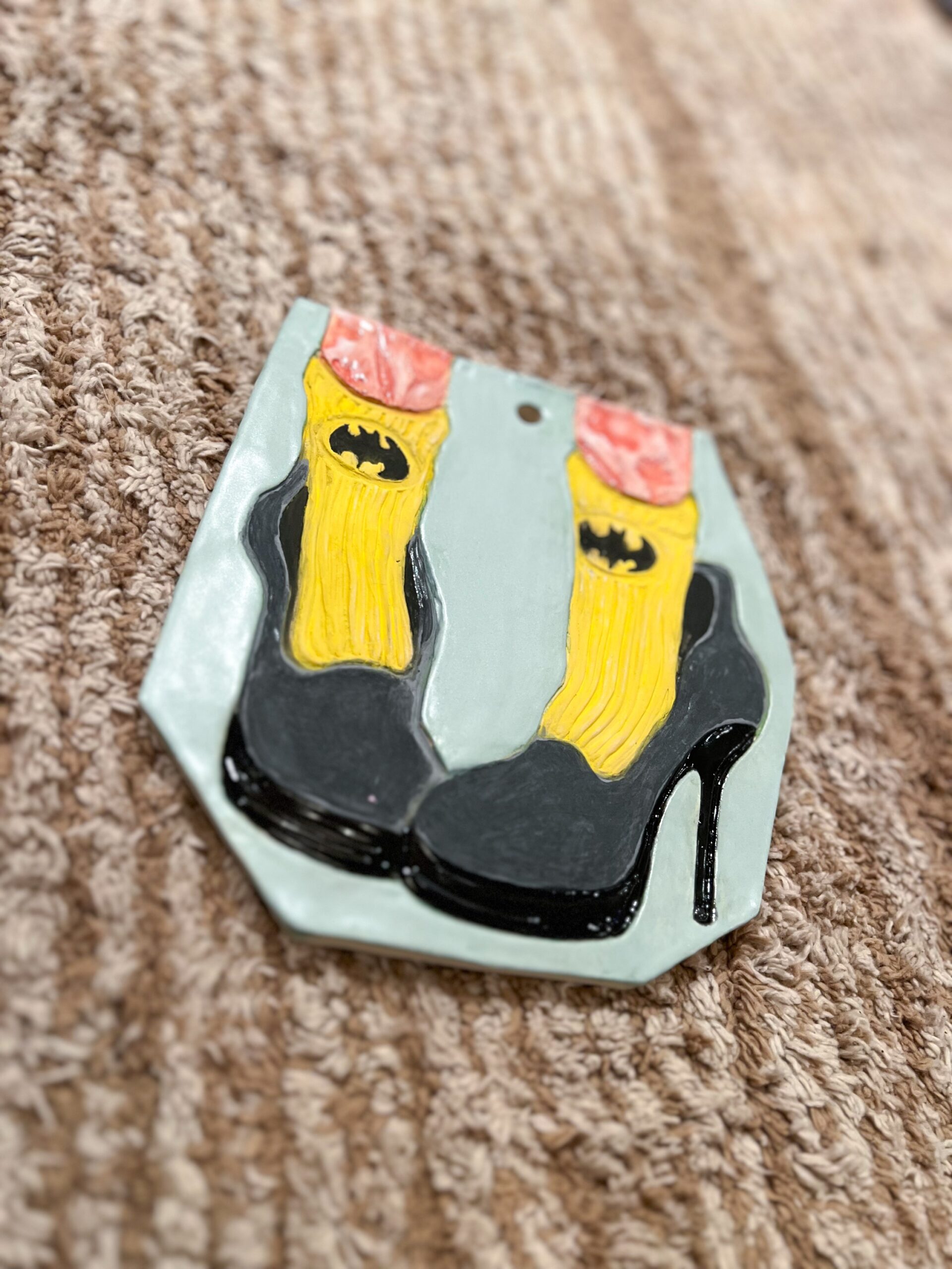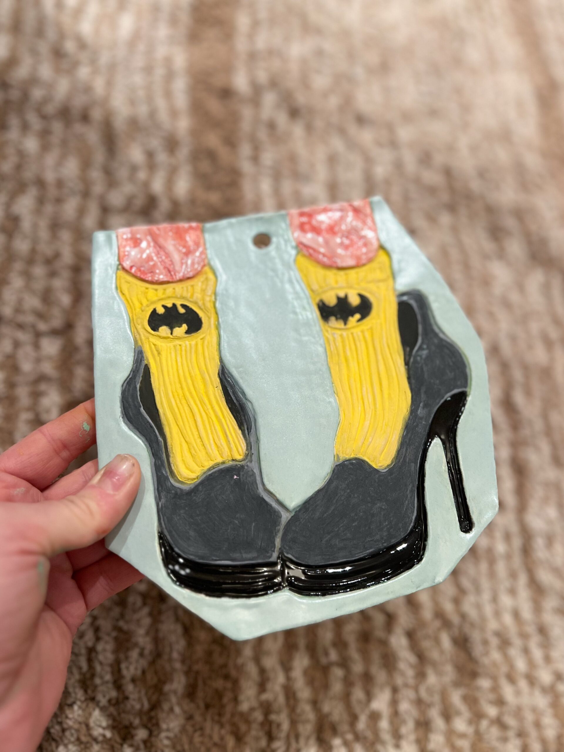 Jeg ELSKER kontrastfyldte ting!! Og det her håndlavede vægophæng i keramik forener moden elegance og barnlig humor i ét udtryk: klassiske stilletter og fødder iført ikoniske Batman-sokker. Det her keramikværk minder om livets mange kontraster og nuancer i et spænd mellem det seje og det fine, det legende og det æstetiske.