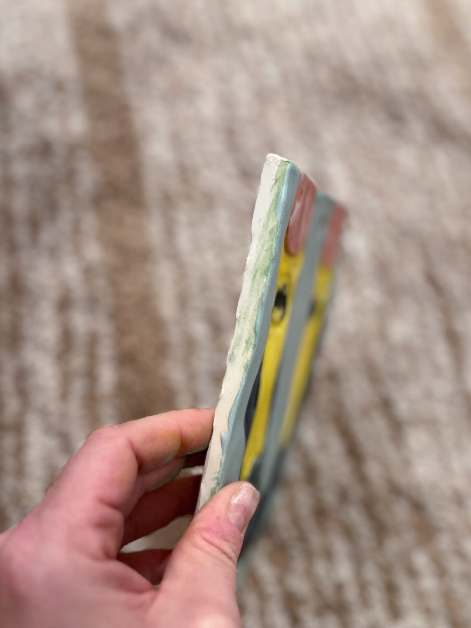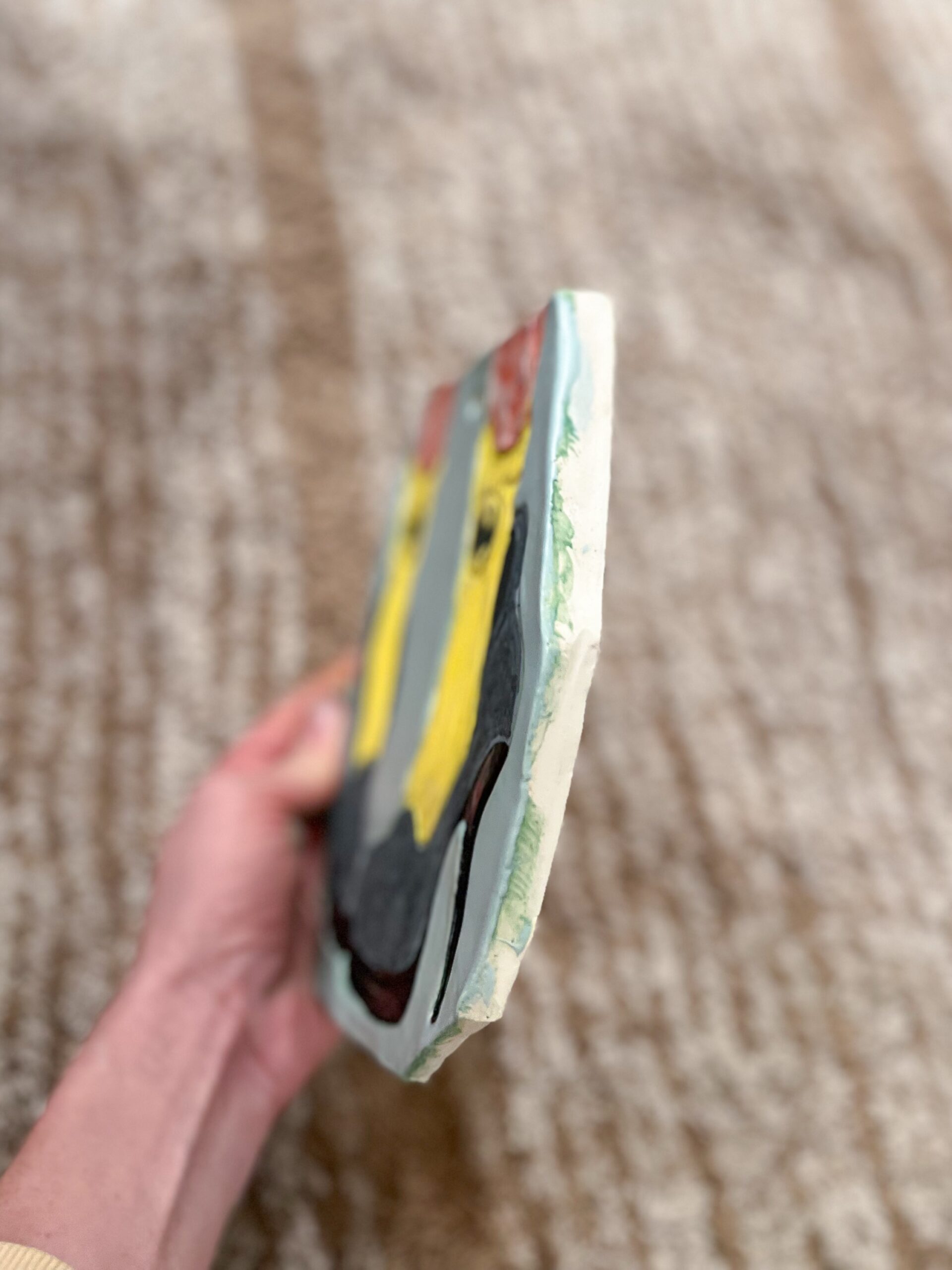 - Sjov info: Her har jeg trykket mit linoleumssnit ned i leret. Motivet findes også som UNIKA-linoleumstryk.