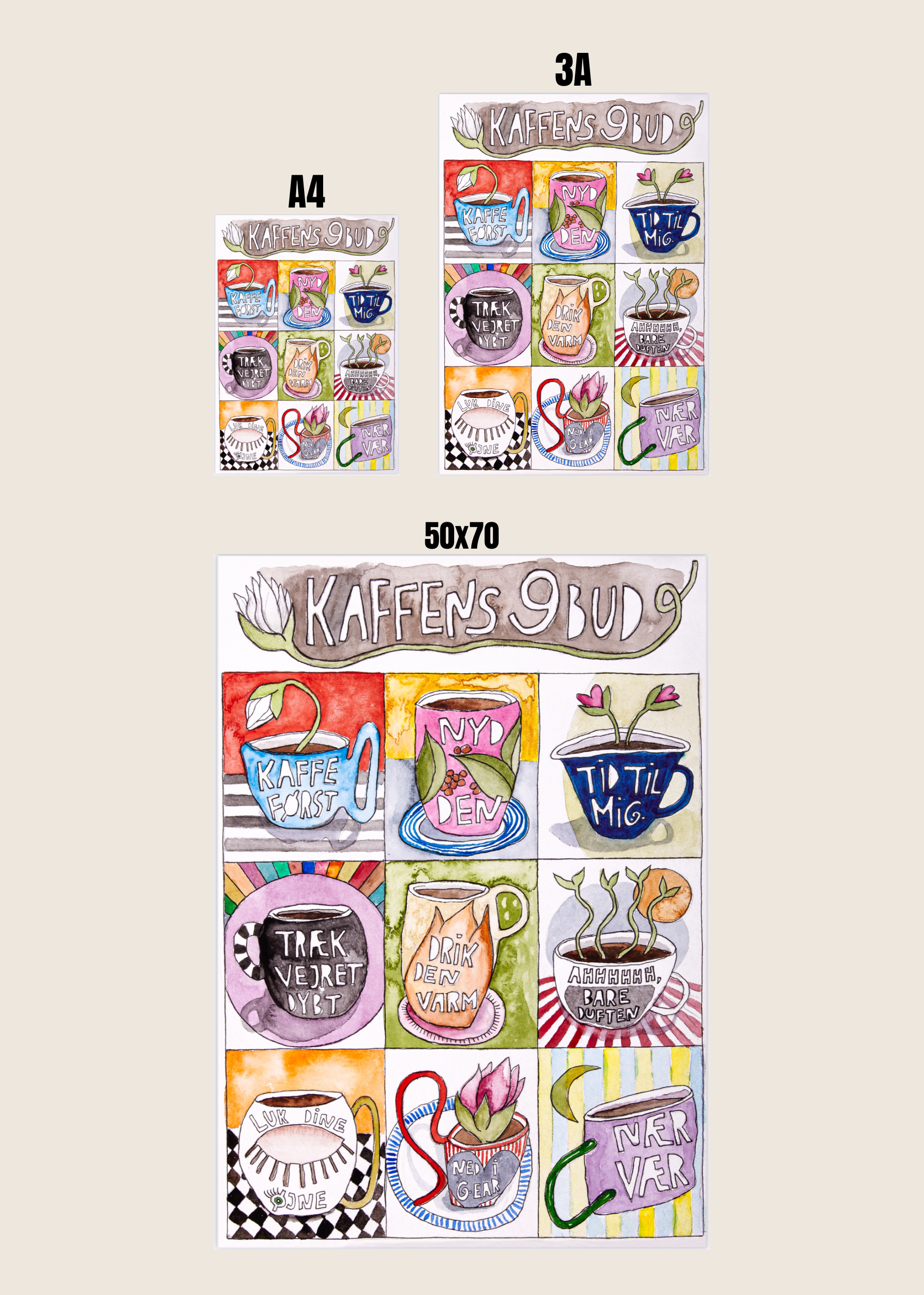 - Kunstplakaten “Kaffens 9 bud” kommer i 3 størrelser: A4, A3 og 50*70 cm