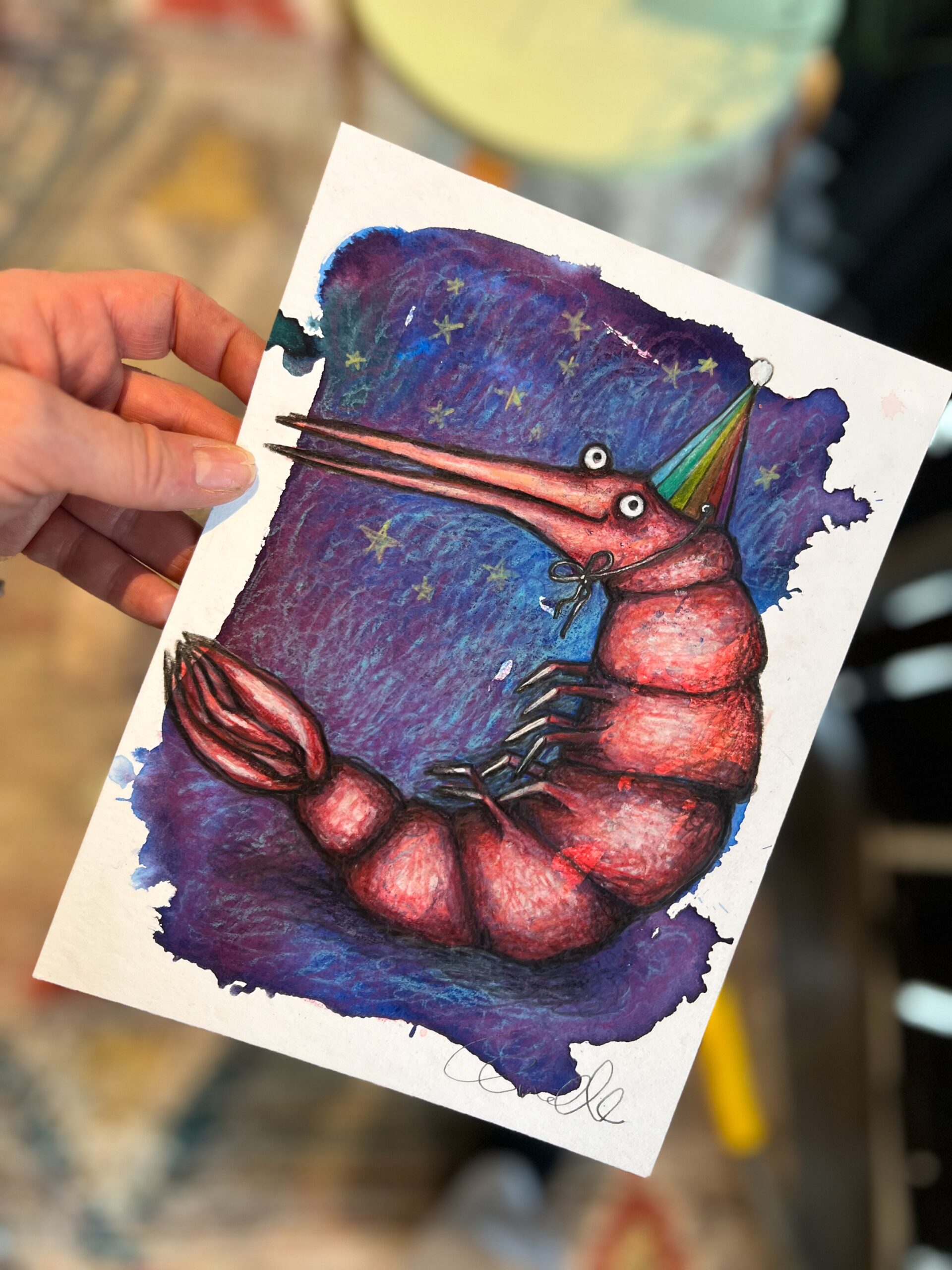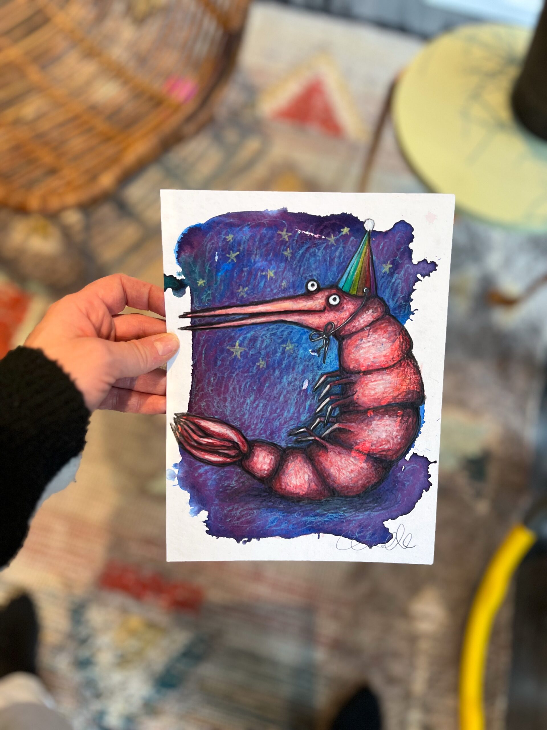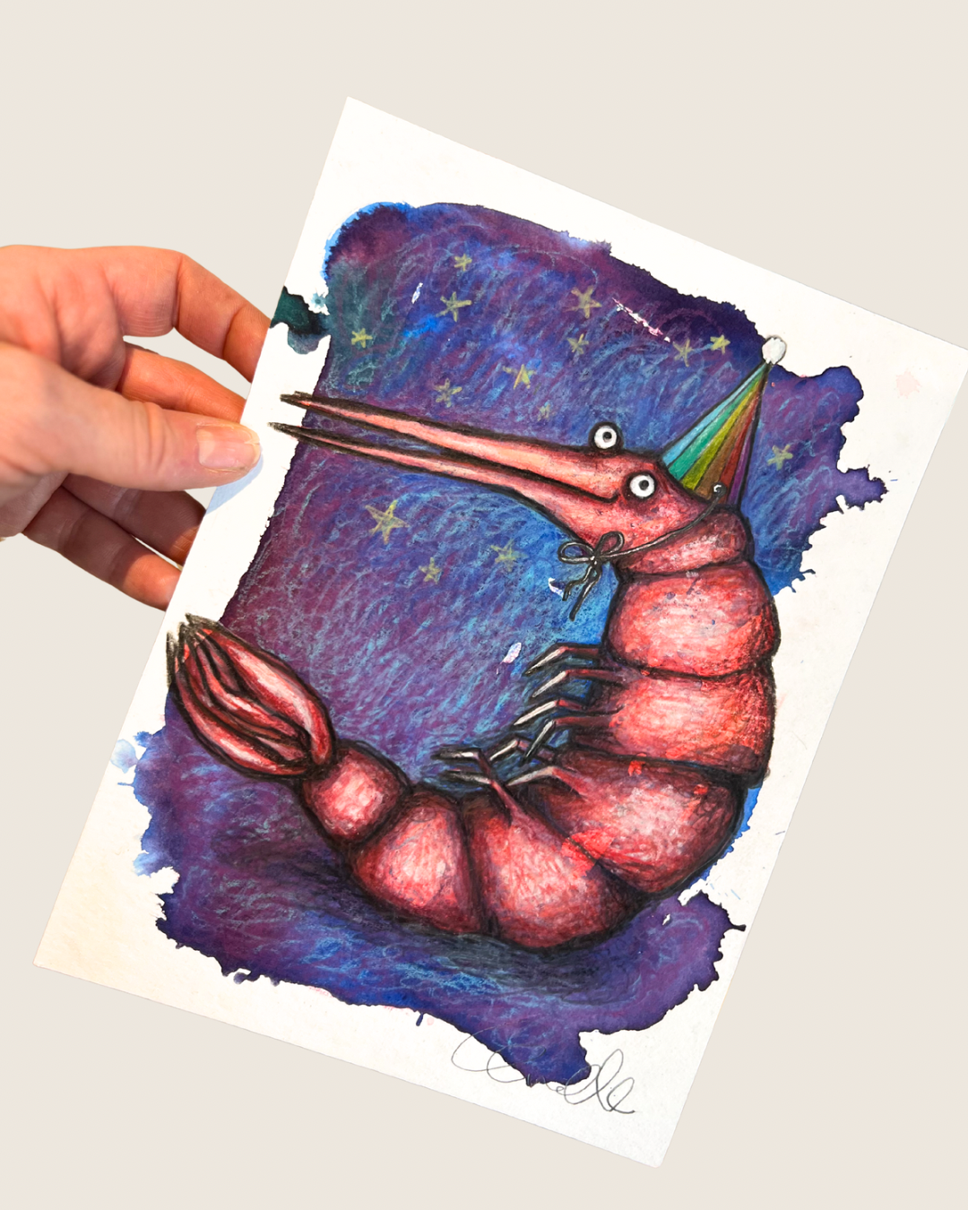 - Det er malet med farveblyant, akvarel, posca-tusch og fineliner på naturhvidt, kraftigt akvarelpapir