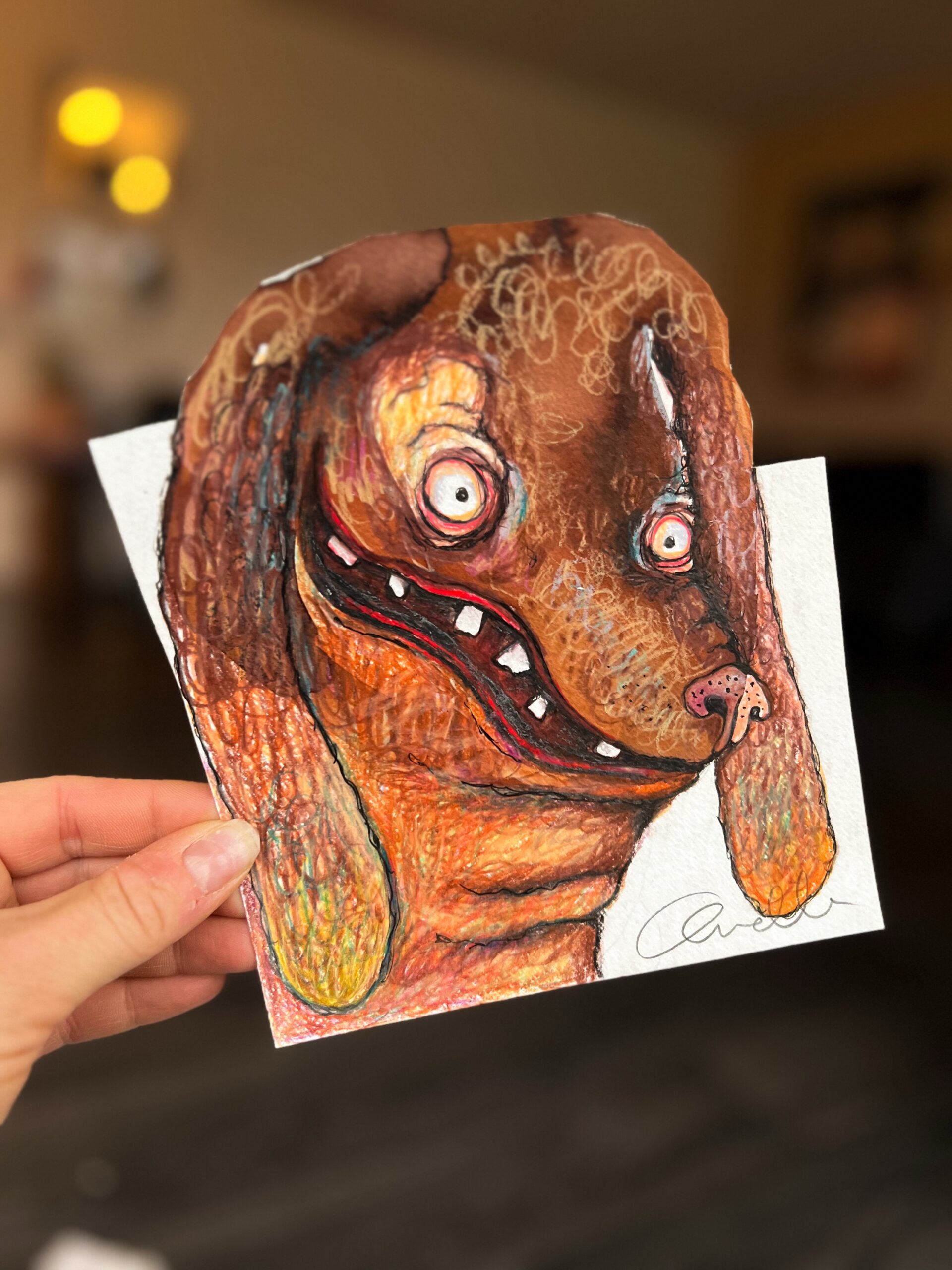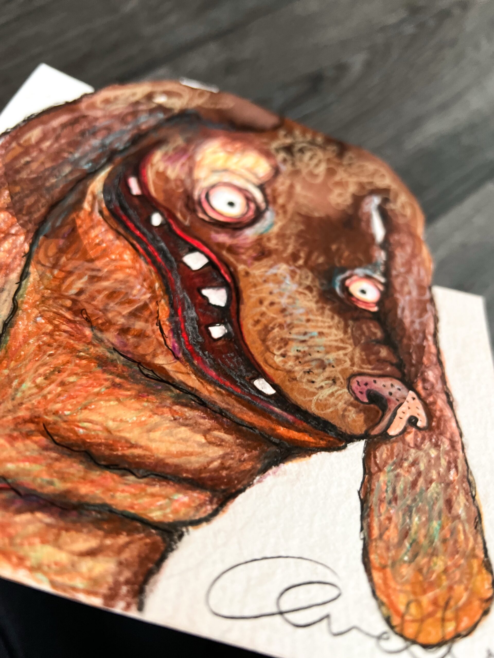 Kunstværk med hunden Rosin, som er ret unik og meget brun. Rosin gør sig bemærket – og skiller sig ud. Derfor er han klippet fri øverst i værket. Lad maleriet ligge frit svævende i ramme med en smuk farve i baggrunden.